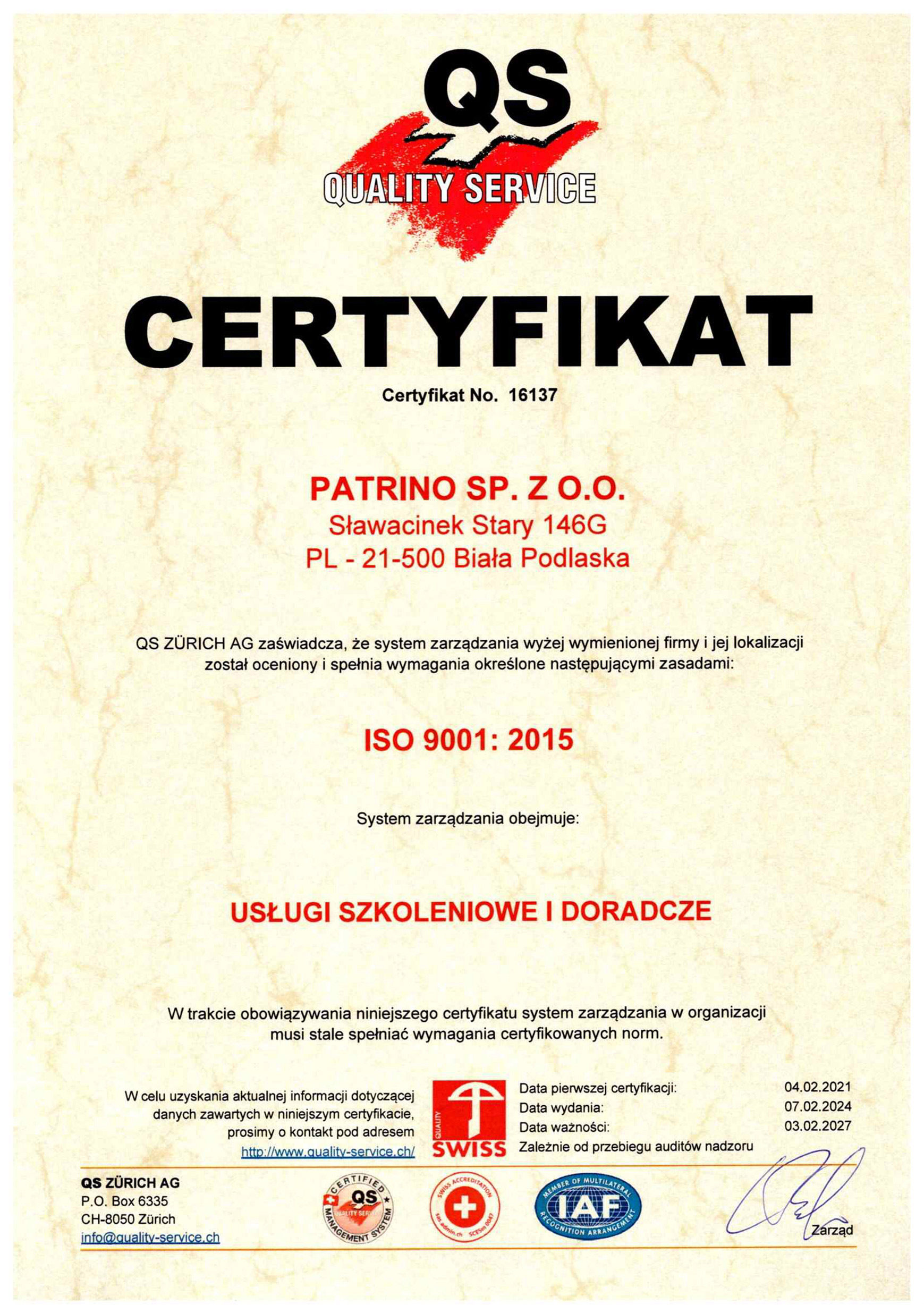 - Posiadamy certyfikat ISO 9001:2015 w zakresie usług szkoleniowych i doradczych.